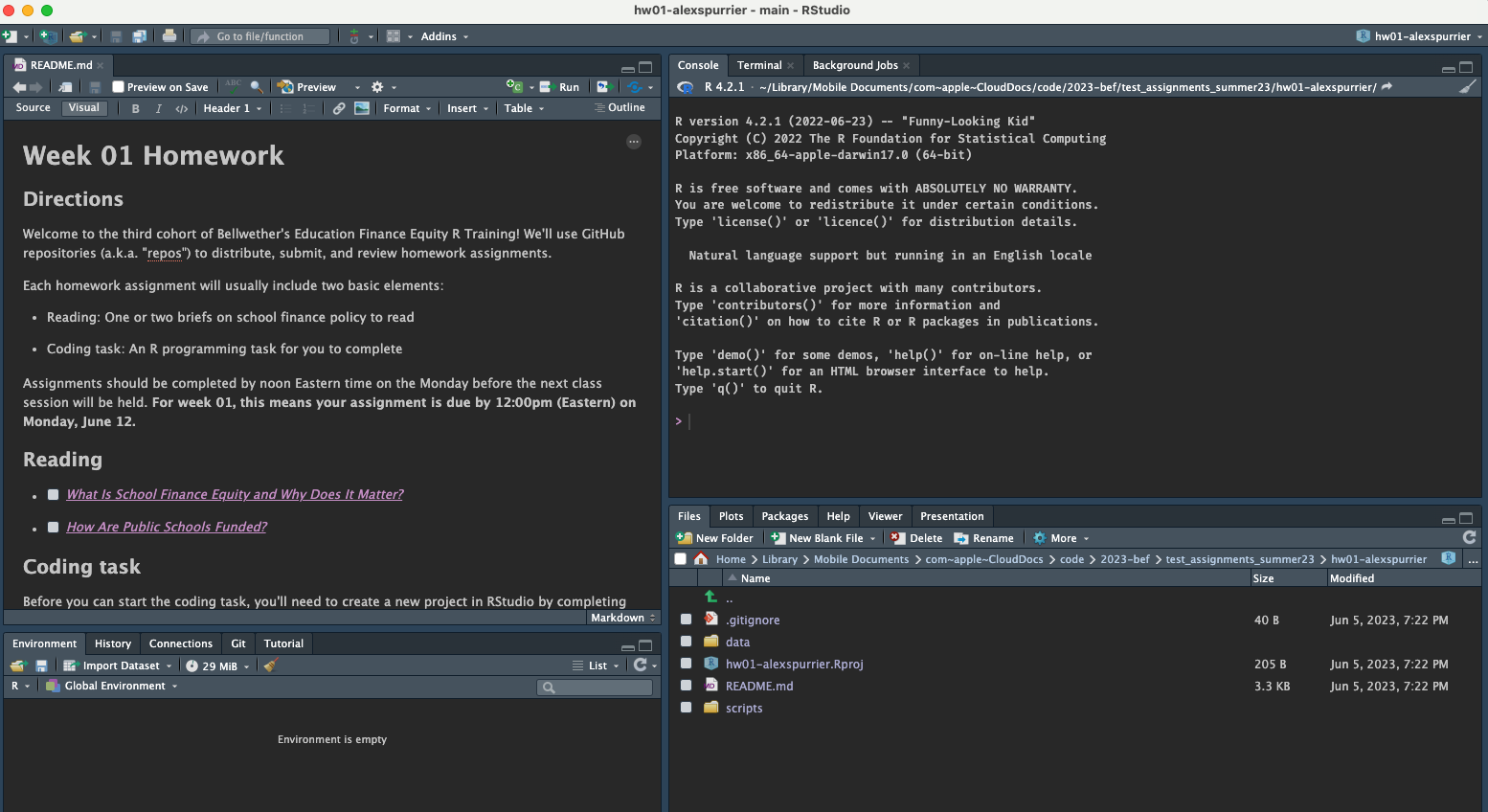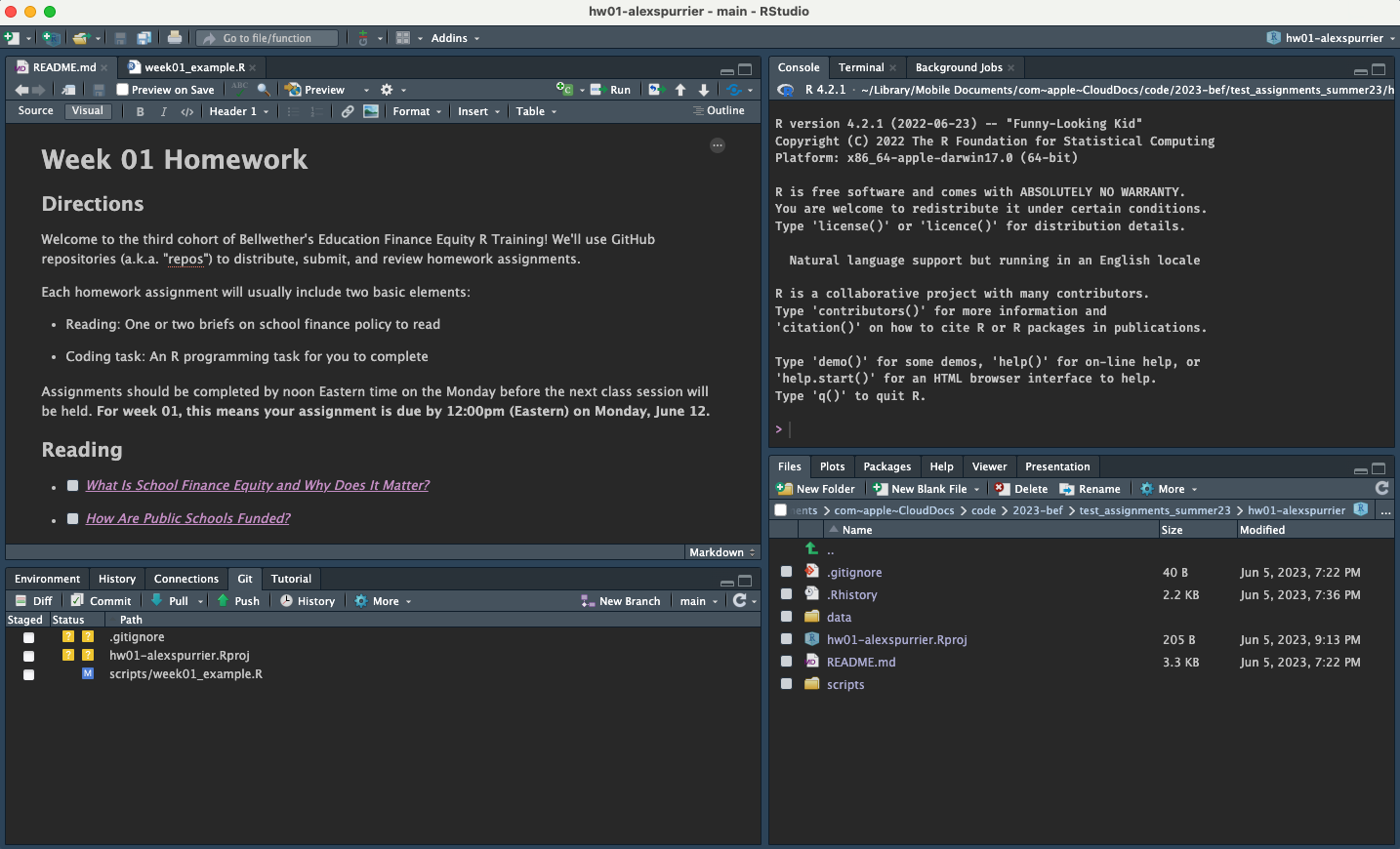 Assignments should be completed by noon Eastern time on the Monday before the next class session will be held. For week 01, this means your assignment is due by 12:00pm (Eastern) on Monday, June 12.