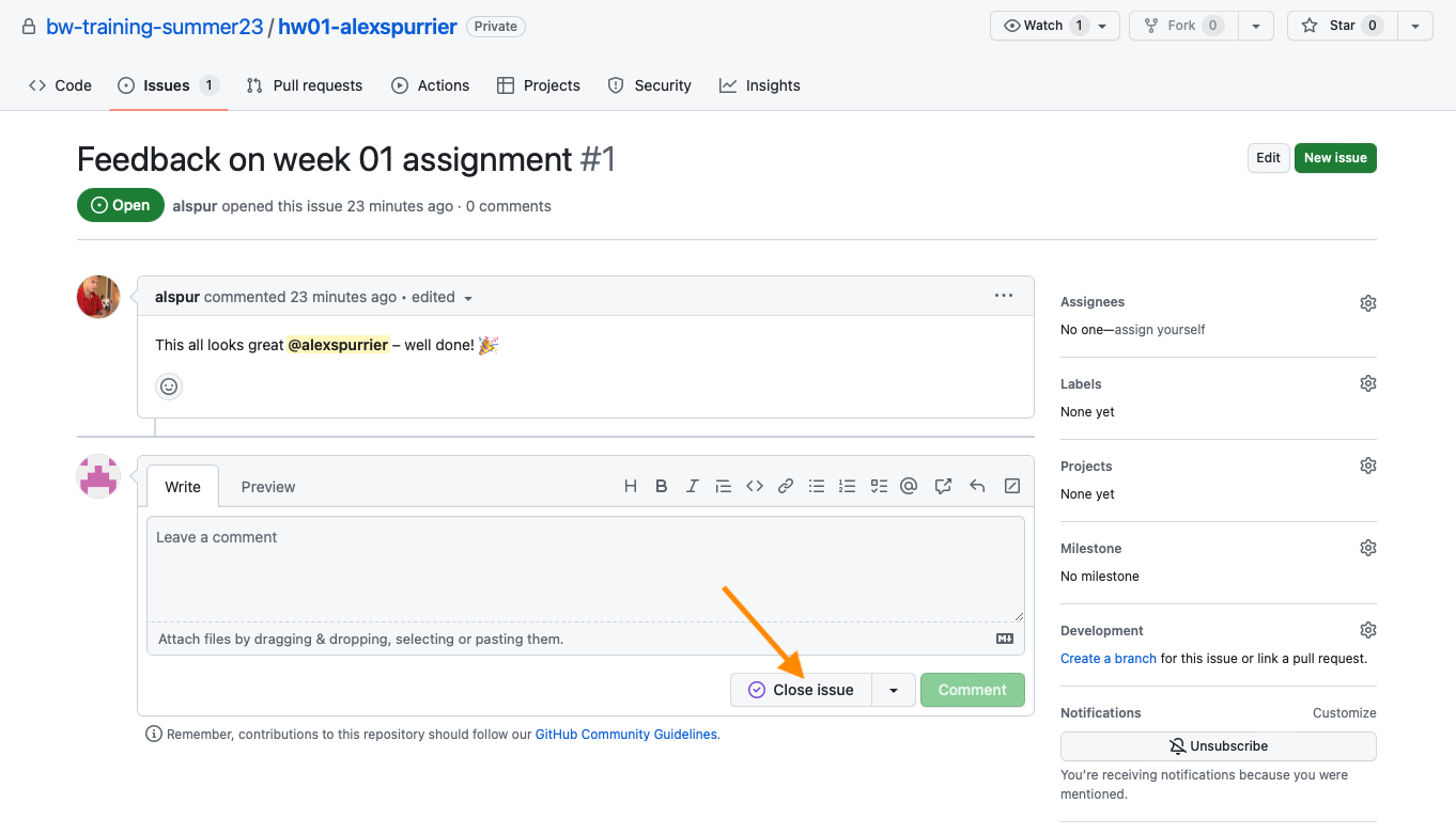 After you receive an email notification that an issue was opened, you can click a link to view it on GitHub. On the issue page, you can respond if you have questions or click “Close issue” if no follow-up is needed.