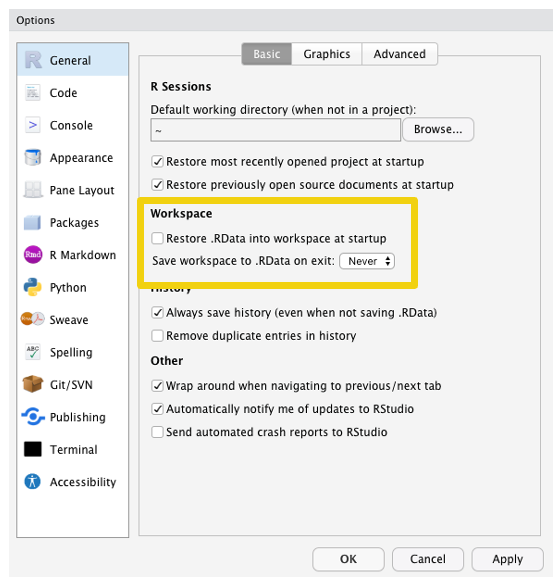 “This will cause you some short-term pain, because now when you restart RStudio it will not remember the results of the code that you ran last time. But this short-term pain will save you long-term agony because it forces you to capture all important interactions in your code. There’s nothing worse than discovering three months after the fact that you’ve only stored the results of an important calculation in your workspace, not the calculation itself in your code.”