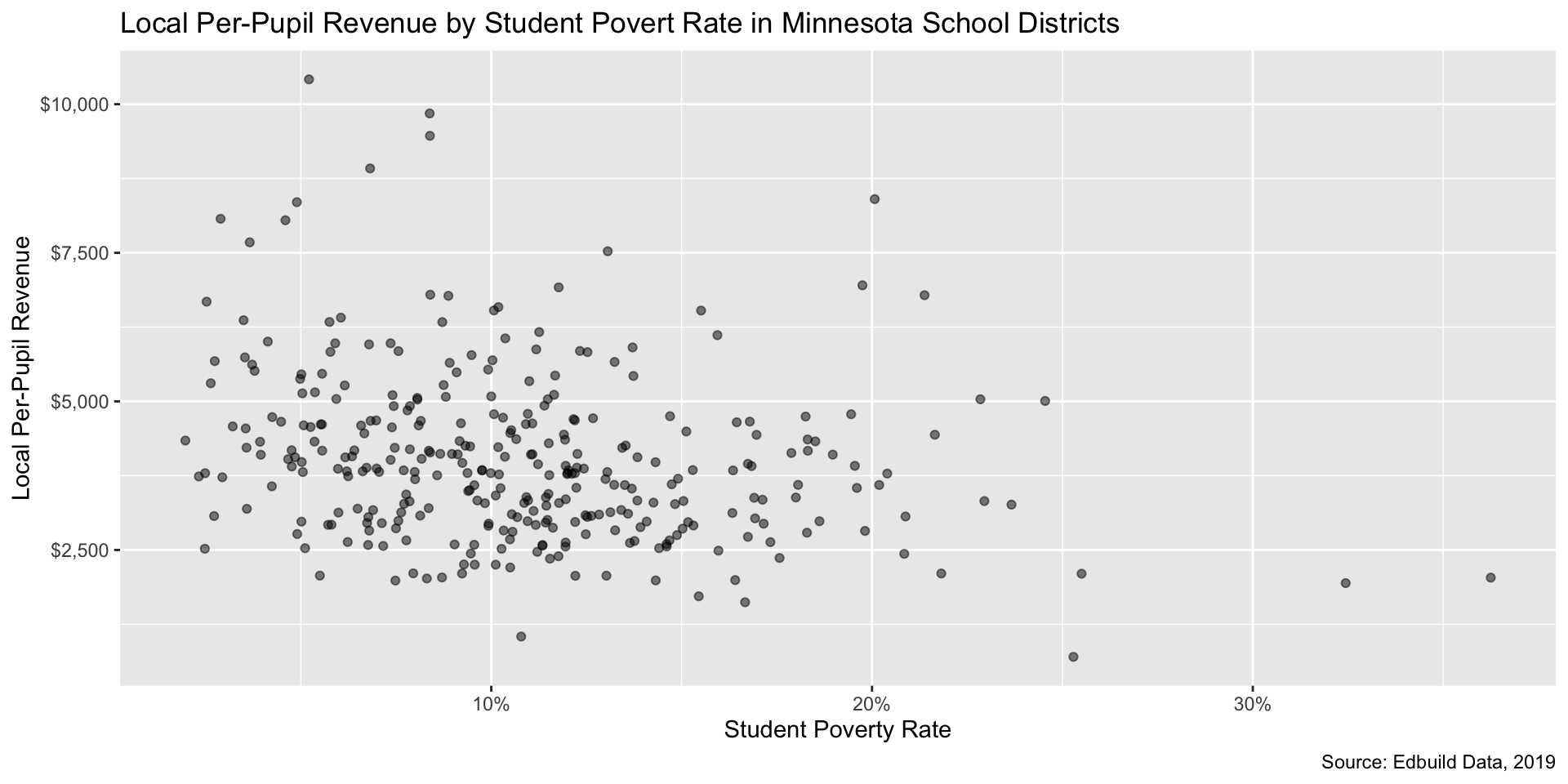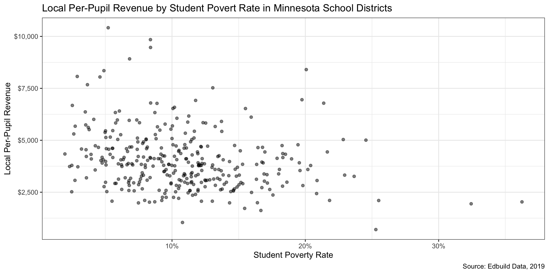 # change themeggplot(mn_ed_clean, aes(x = pov_pct, y = local_rev_pp)) +geom_point(alpha = .5) +scale_x_continuous(labels =label_percent()) +scale_y_continuous(labels =label_dollar()) +labs(x ="Student Poverty Rate", y ="Local Per-Pupil Revenue",title ="Local Per-Pupil Revenue by Student Povert Rate in Minnesota School Districts",caption ="Source: Edbuild Data, 2019") +theme_bw()