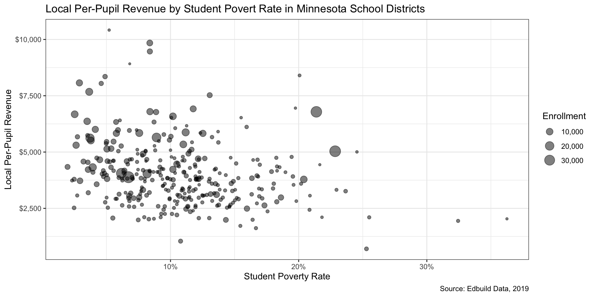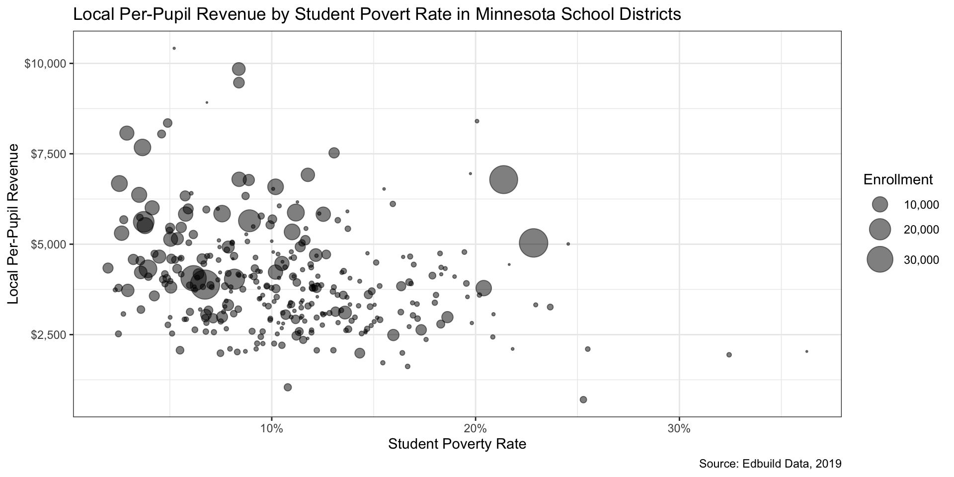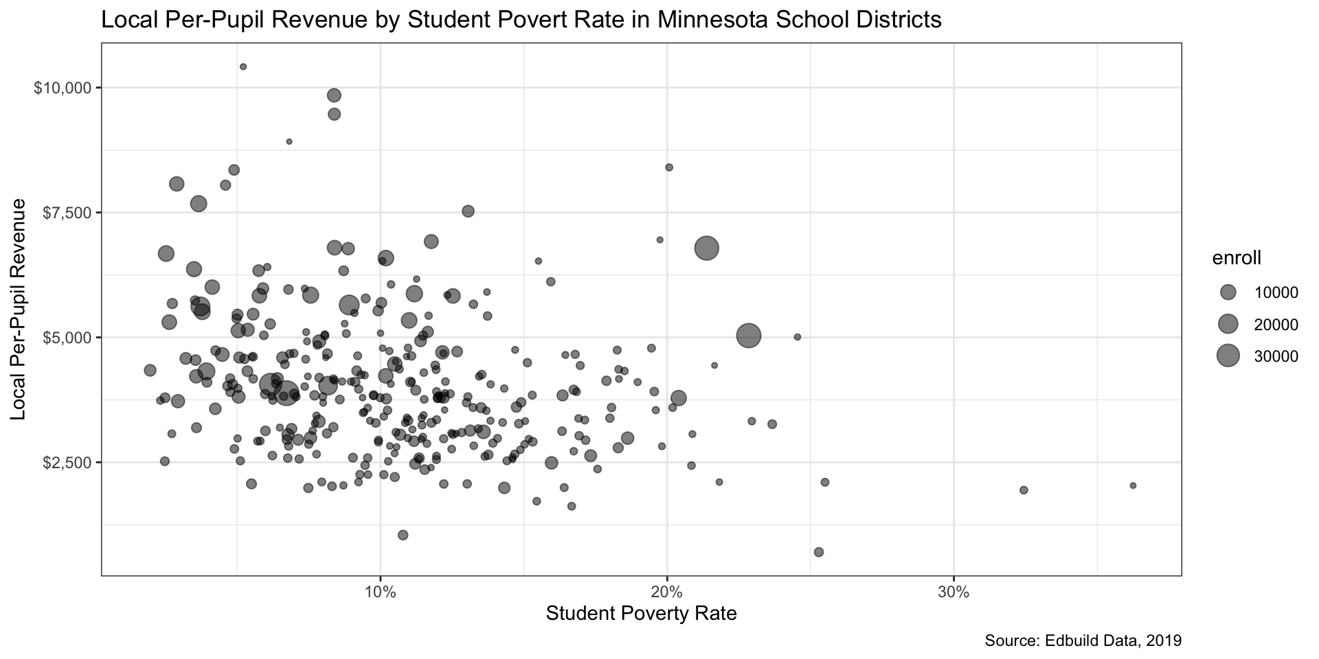 # add size element ggplot(mn_ed_clean, aes(x = pov_pct, y = local_rev_pp, size = enroll)) +geom_point(alpha = .5) +scale_x_continuous(labels =label_percent()) +scale_y_continuous(labels =label_dollar()) +labs(x ="Student Poverty Rate", y ="Local Per-Pupil Revenue",title ="Local Per-Pupil Revenue by Student Povert Rate in Minnesota School Districts",caption ="Source: Edbuild Data, 2019") +theme_bw()