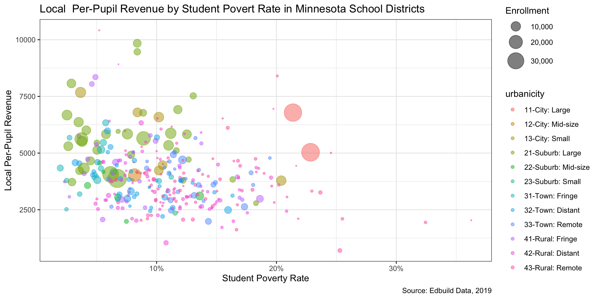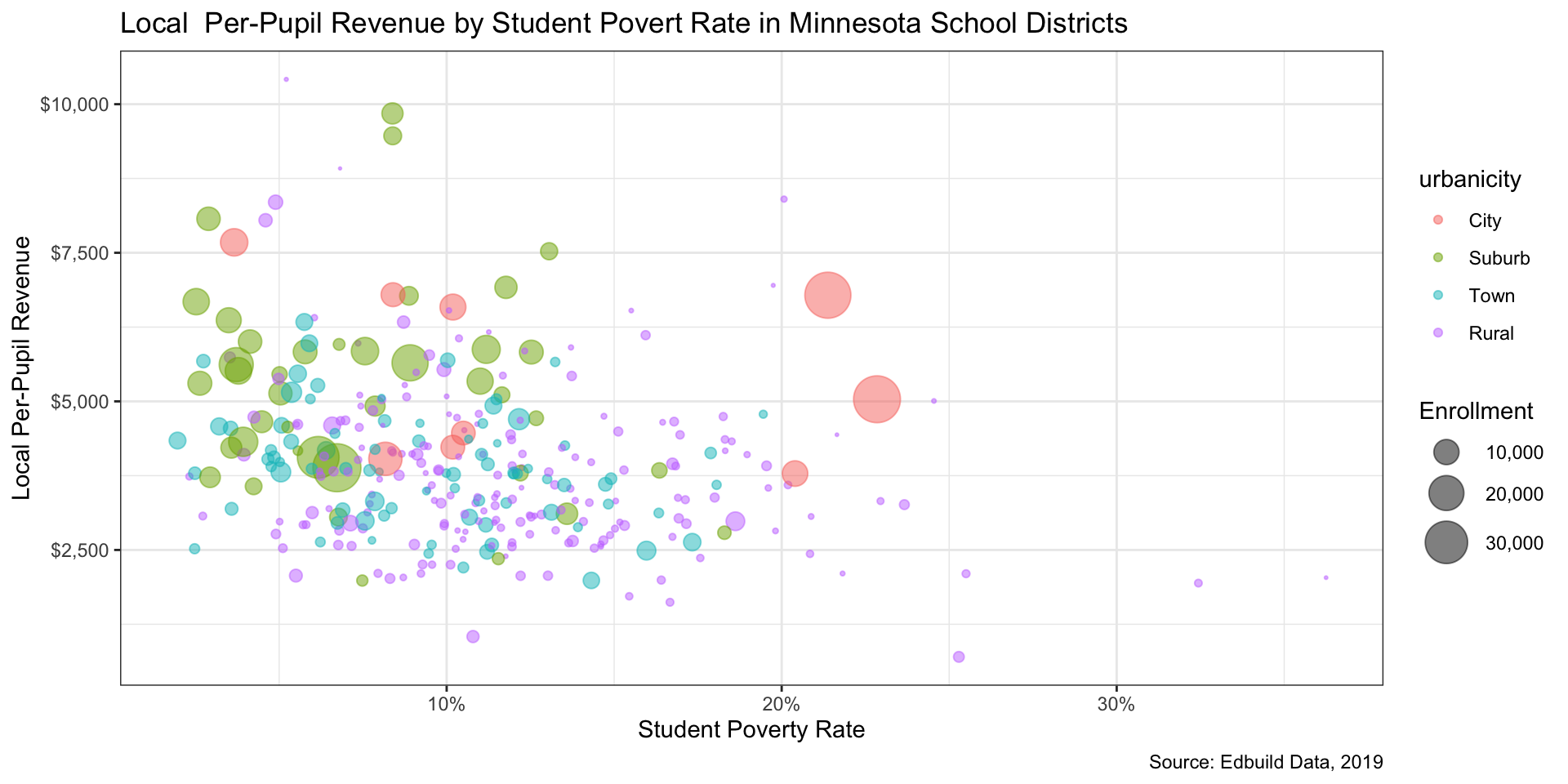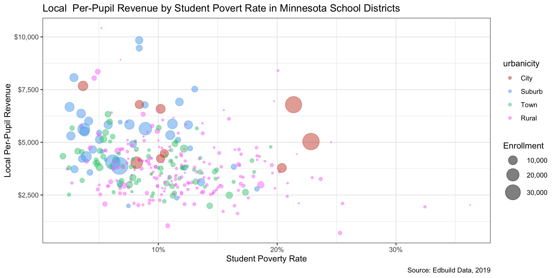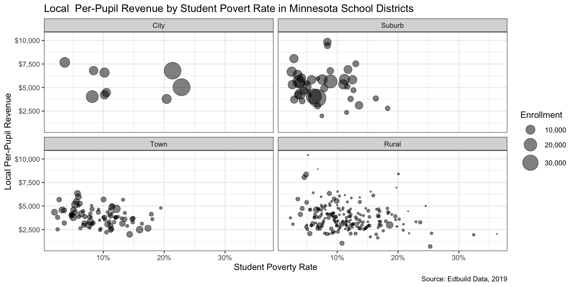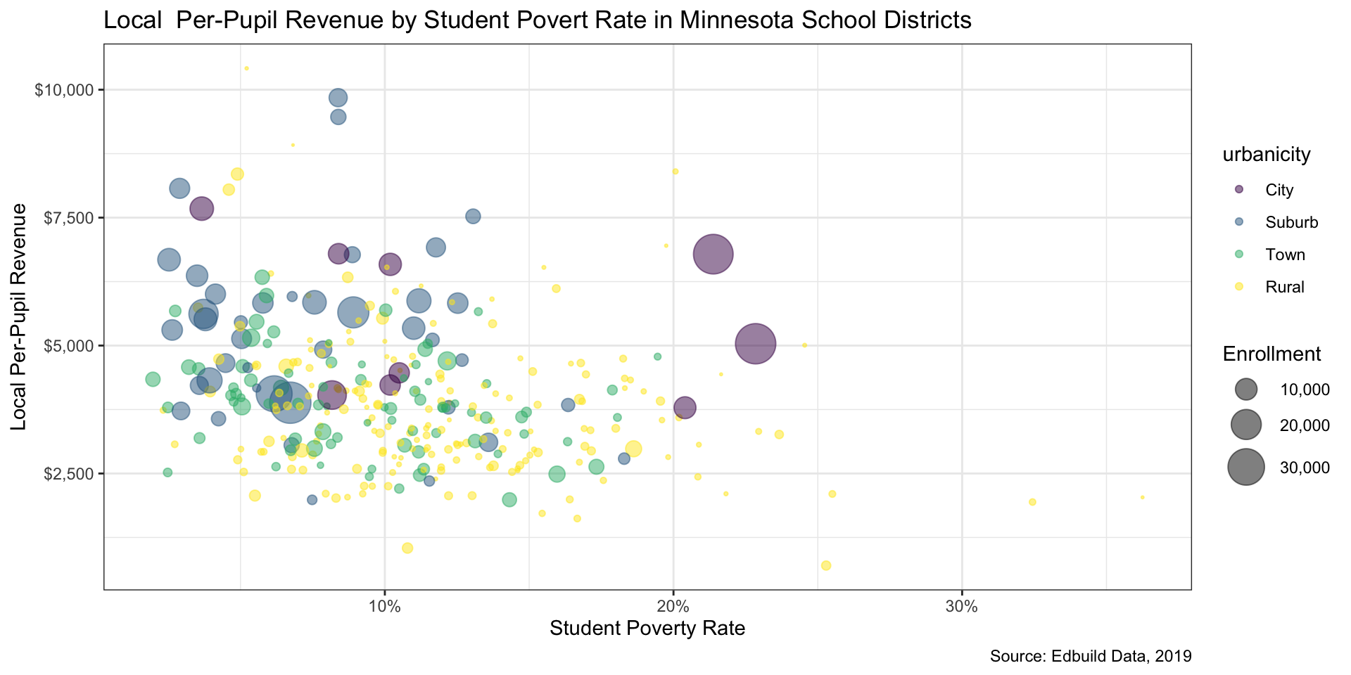 # clean up the unicorn vomitmn_ed_clean <- mn_ed_clean |>mutate(urbanicity =fct_collapse(as.factor(urbanicity),City =c("11-City: Large", "12-City: Mid-size","13-City: Small"),Suburb =c("21-Suburb: Large","22-Suburb: Mid-size","23-Suburb: Small"),Town =c("31-Town: Fringe","32-Town: Distant","33-Town: Remote"),Rural =c("41-Rural: Fringe","42-Rural: Distant","43-Rural: Remote")))# better colors and tidy legend labelggplot(mn_ed_clean, aes(x = pov_pct, y = local_rev_pp, size = enroll,color = urbanicity)) +geom_point(alpha = .5) +scale_x_continuous(labels =label_percent()) +scale_y_continuous(labels =label_dollar()) +scale_size_area(labels =label_comma(), max_size =10) +labs(x ="Student Poverty Rate", y ="Local Per-Pupil Revenue",title ="Local Per-Pupil Revenue by Student Povert Rate in Minnesota School Districts",caption ="Source: Edbuild Data, 2019",size ="Enrollment") +theme_bw()