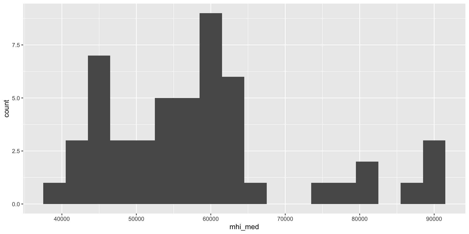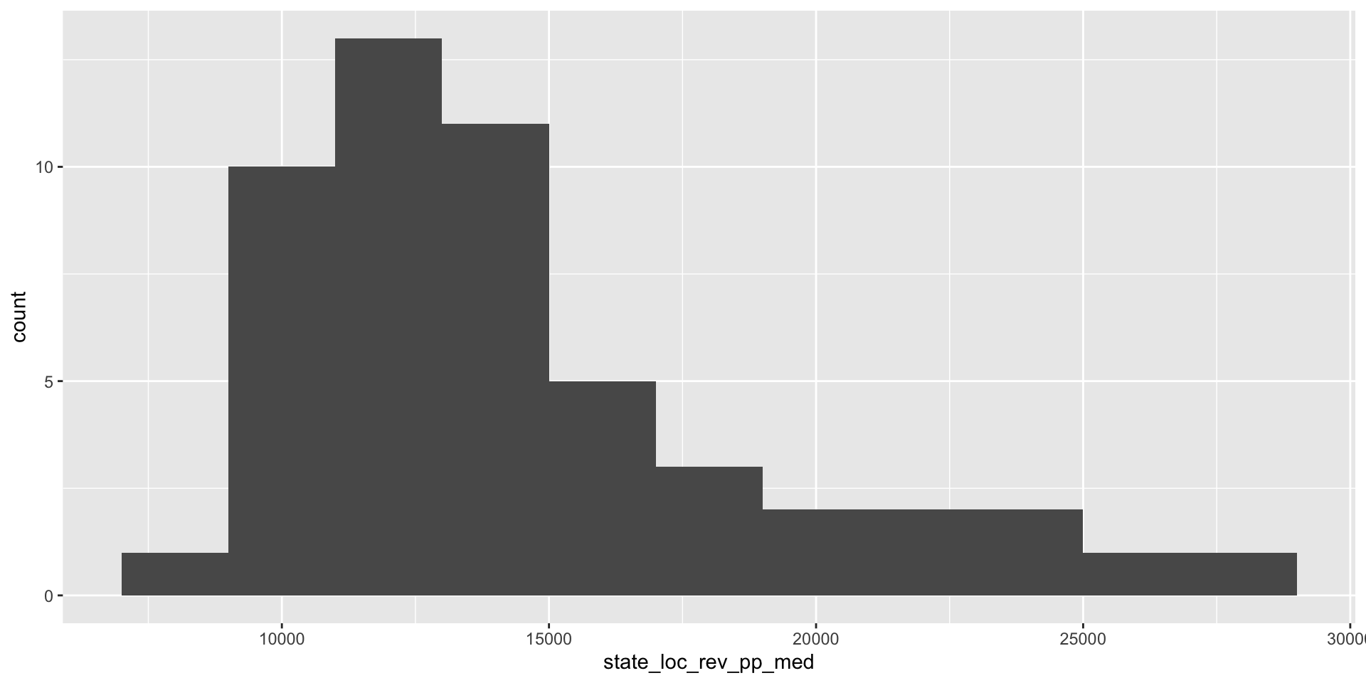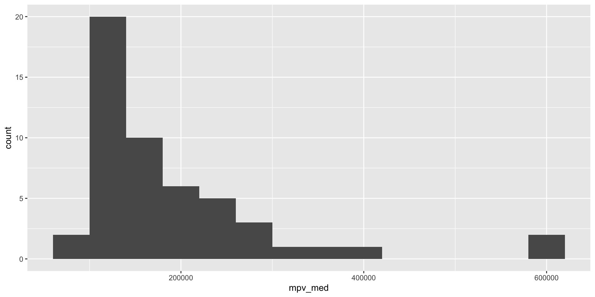 # Several people took an extra step and hard coded in the valuemedian(sd_data$MHI, na.rm = T)mhi_median <-57199# You can streamline the code like this: mhi_median <-median(sd_data$MHI, na.rm = T)# We avoid hard coding variables because if you update the data set and the 'MHI' # variable updates, then 'mhi_median' will automatically update. # find the median value of median property value (MPV) and store the result in a variable called `mpv_median`mpv_median <-median(sd_data$MPV, na.rm = T)# find the median value of state revenue per pupil (SRPP) and store the result in a variable called `srpp_median`srpp_median <-median(sd_data$SRPP, na.rm = T)# find the median value of local revenue per pupil (LRPP) and store the result in a variable called `lrpp_median`lrpp_median <-median(sd_data$LRPP, na.rm = T)