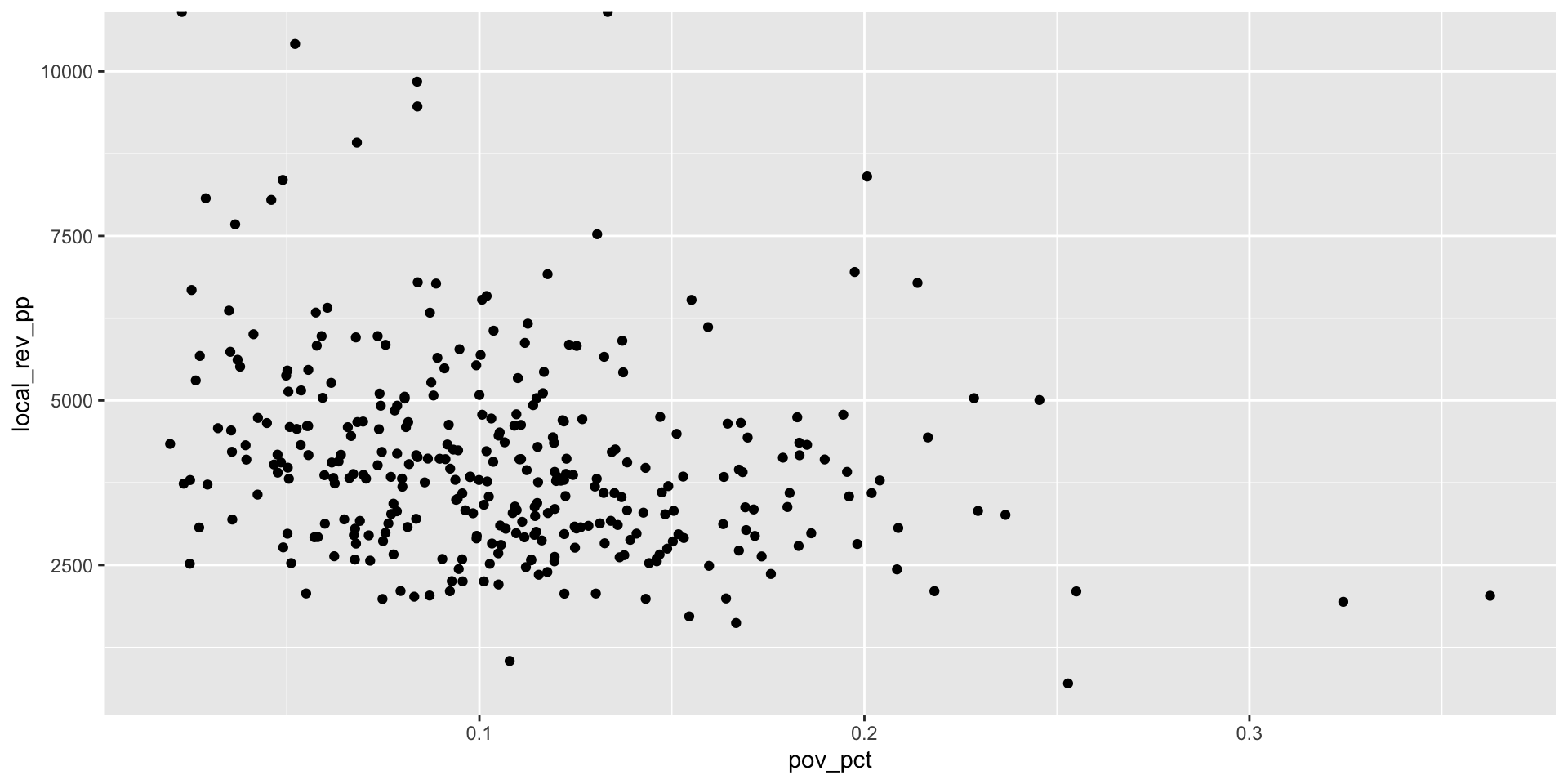 # create tidy dfmn_ed_clean <- mn_ed_data |>filter(!is.na(local_rev_pp), !is.na(pov_pct))view(mn_ed_clean)# Drop the 2 districts that have no enrollmentmn_ed_clean <- mn_ed_clean |>filter(enroll >0)# first minnesota plot w/ clean dataggplot(mn_ed_clean, aes(x = pov_pct, y = local_rev_pp)) +geom_point()