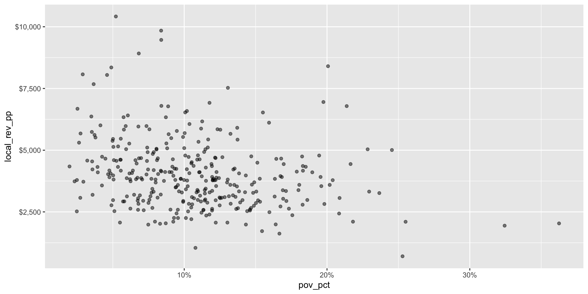 # format axes library(scales)# format the x and y axesggplot(mn_ed_clean, aes(x = pov_pct, y = local_rev_pp)) +geom_point(alpha = .5) +# make sure you have the `scales` package loaded!scale_x_continuous(labels =label_percent()) +scale_y_continuous(labels =label_dollar())